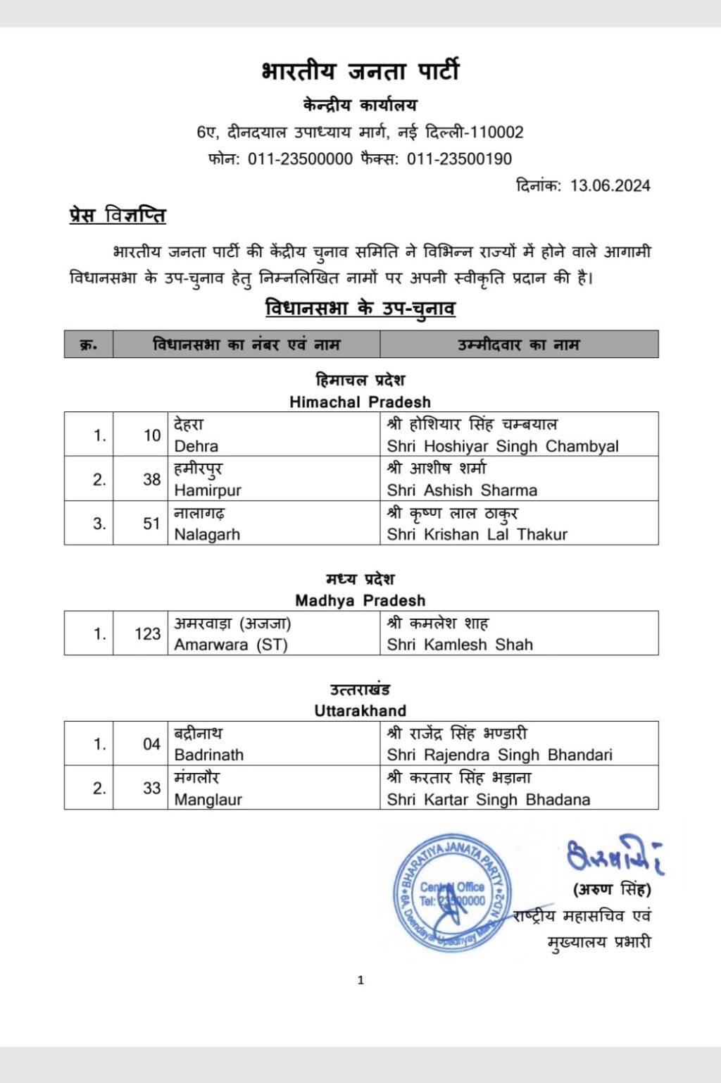 मंगलौर विधानसभा उपचुनाव के लिए बीजेपी से करतार सिंह भड़ाना का टिकट किया फाइनल,